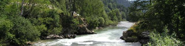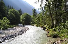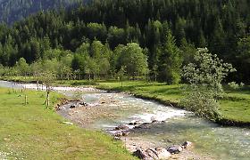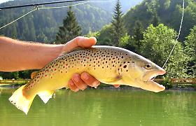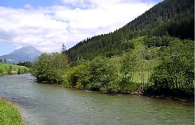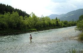 |   | Die Enns bei Flachau Am nächsten Tag begutachteten wir früh am Morgen, keine 300m vom Hotel Lisa entfernt, die Enns. Diese entspringt in den Radstädter Tauern und mündet nach ca. 250 Kilometer in die Donau. Eher klein und unscheinbar beginnt sie ihre Reise durch die atemberaubende Alpenlandschaft, das Dachsteinmassiv zur Linken, die Niederen Tauern zu Rechten. In dieser grandiosen Umgebung den Forellen nachzustellen ist eine besondere Herausforderung. Die Fischerei gleicht einer Pirsch. Die besten Stellen sind hier tiefe Gumpen, Kehren und unterspülte Uferbereiche. Leichtes Gerät ist angesagt und es macht Spaß hier den Forellen nachzustellen. Direkt neben der Enns befindet sich eine kleine Teichanlage mit wunderschön gezeichneten Bach- und Regenbogenforellen. Wer will kann auch hier sein Glück versuchen. Aufgrund der Vielzahl der hauseigenen Fischereimöglichkeiten des Hotels (Torrener Ache, Salza, Mondseer Ache, Salzach), gibt es selbst bei Schlechtwetter genug Alternativen in der näheren Umgebung. Revier